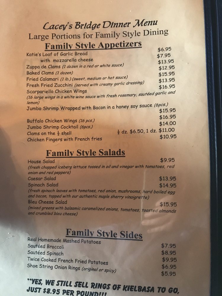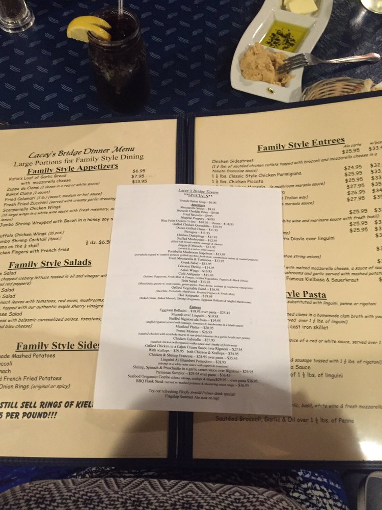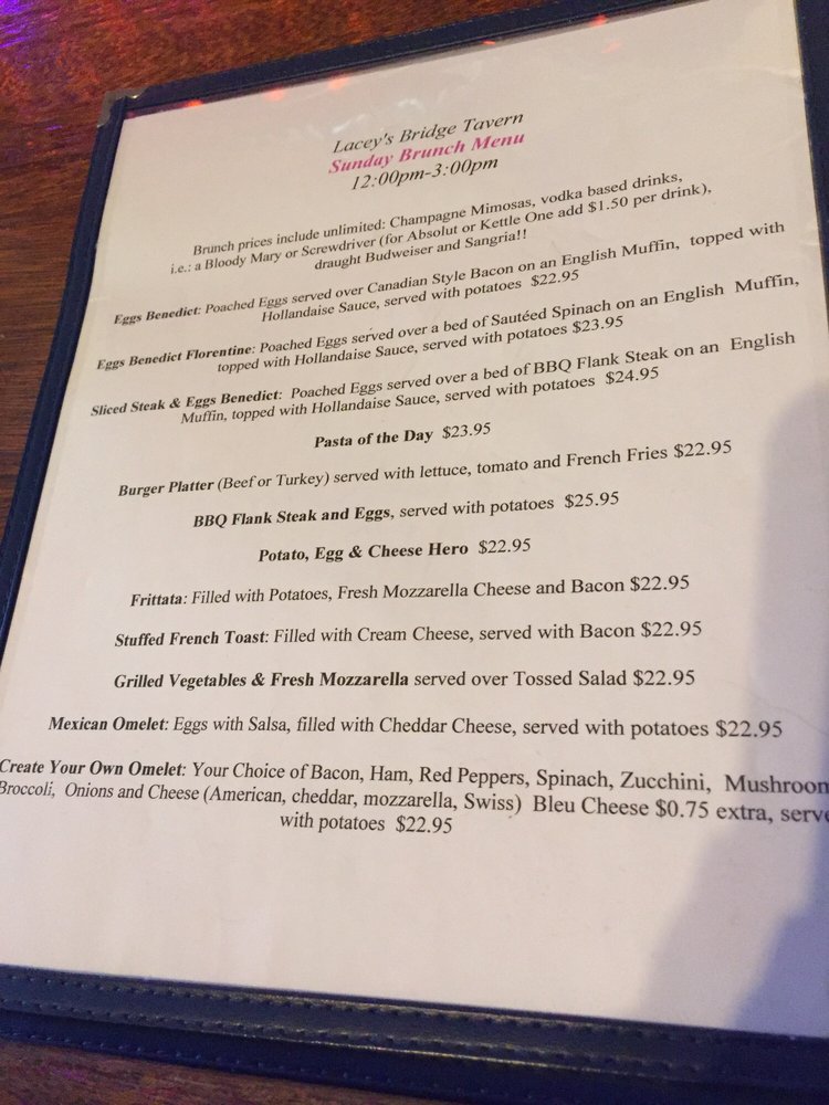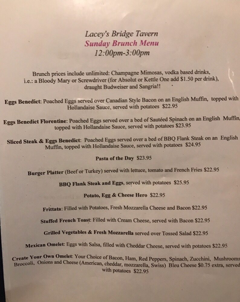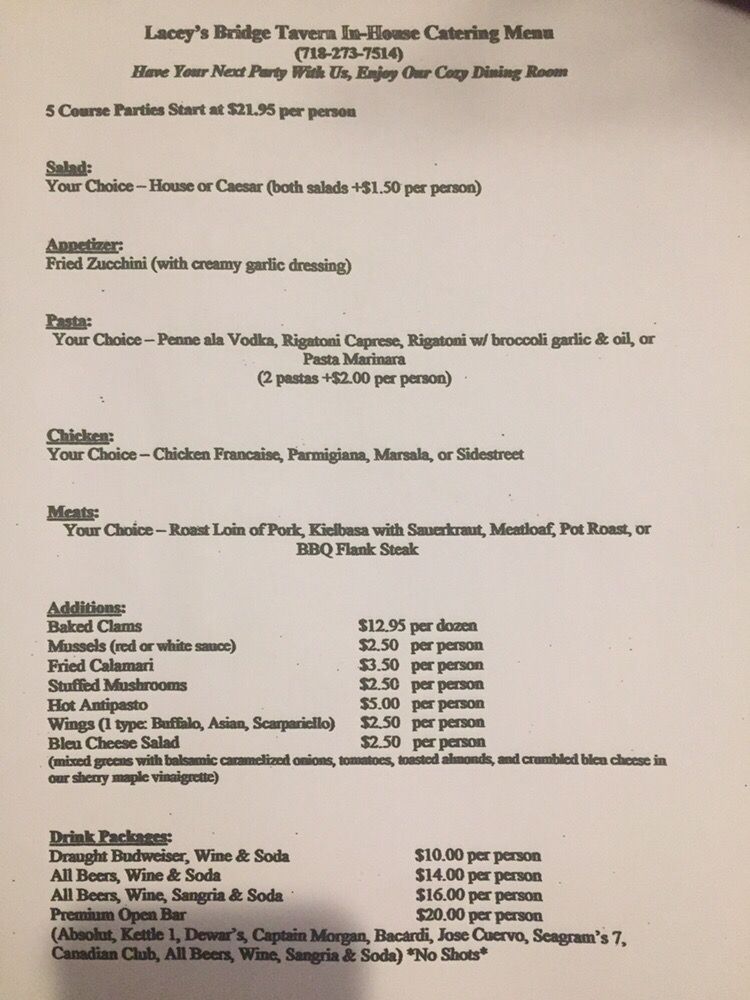 Introducing the menu at Lacey's Bridge Tavern, a hidden gem in Staten Island, offering American, Seafood, Breakfast, and Brunch options. With a cozy atmosphere and friendly service, this tavern is praised for its hearty family-style meals at reasonable prices. Customers rave about the exceptional flavor, generous portions, and affordability of dishes like the cold seafood platter. The menu caters to all tastes, providing something for everyone, whether you're craving fresh seafood, burgers, or chicken Gabrielle with fresh mozzarella. Lacey's Bridge Tavern is a great spot for brunch, lunch, dinner, or dessert, perfect for a casual meal with friends or a special occasion. The welcoming staff, full bar, and free Wi-Fi add to the overall charm of this neighborhood favorite. Consider Lacey's Bridge Tavern for your next dining experience and enjoy a taste of Old Island charm.